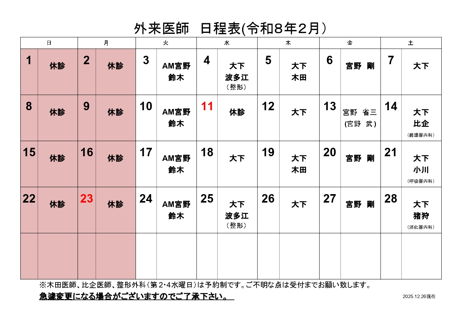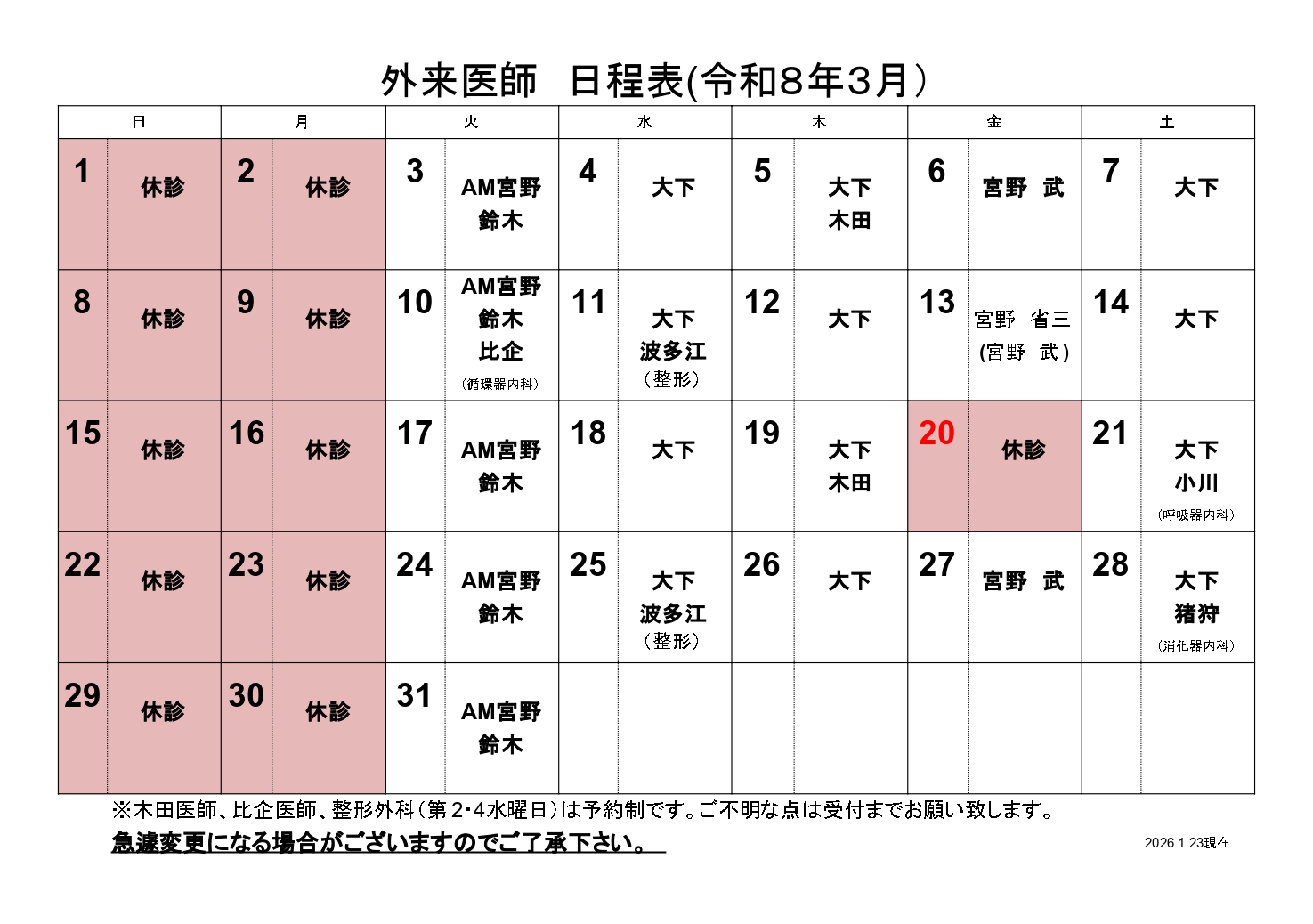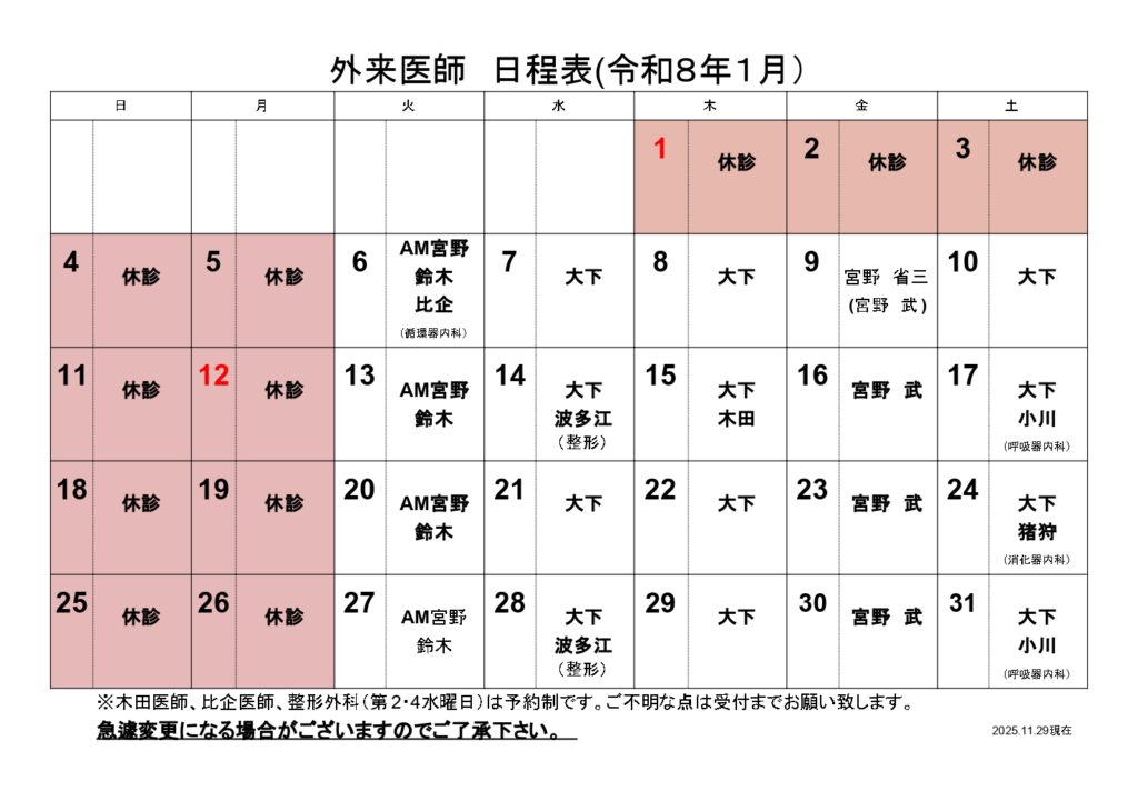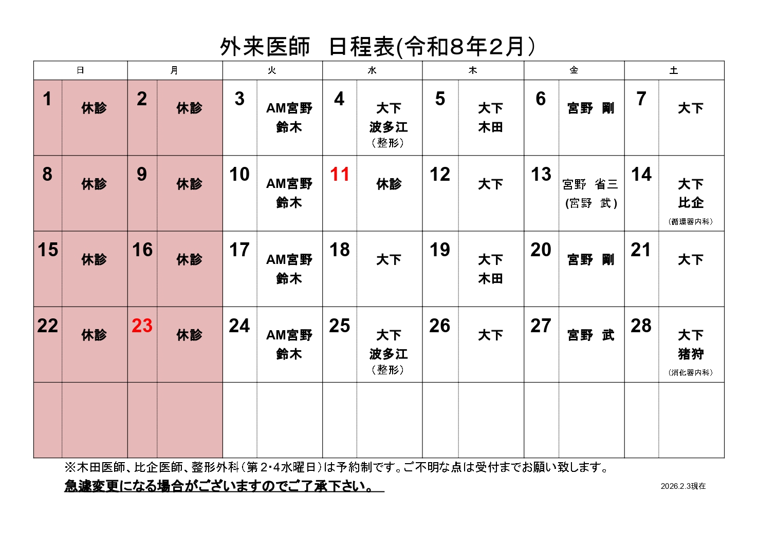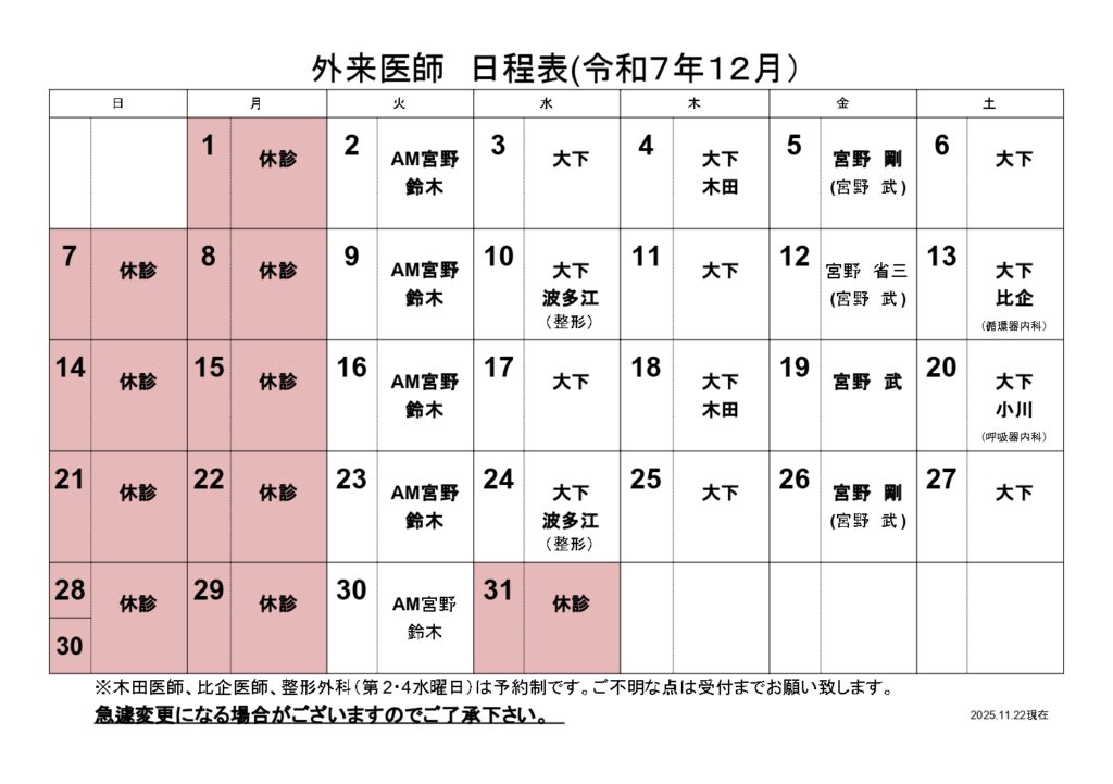 | 受付時間 | 8:15~11:30 13:30~16:30 【火曜日~土曜日】 ・第4土曜日:上部(胃)消化器内視鏡検査は、専門医によりまとめて施行しております。 ・第1・第3木曜日:膠原病・リウマチ及び、糖尿病専門医の診療を行っております。 ・月に1回、循環器内科の専門医の診療を行っております。 ・第2・第4水曜日:整形外科の専門医の診療を行っております。 |